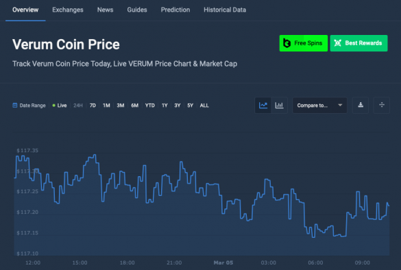 The current price of Verum Coin is $117.20, with a 24-hour trading volume of $7,367.00. Its market capitalization stands at $1.17 million.